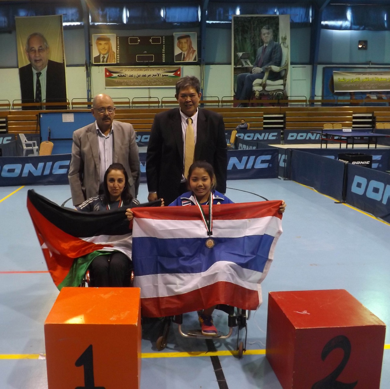 وشارك في فعاليات التتويج كل من السفير التايلندي في الأردني بونبونج جانيت تانون، والأمين العام للجنة البارالمبية الأردنية ألانسة مها البرغوثي ومدير البطولة السيد سليمان الروسان – رئيس النادي الوطني-، وأمين الصندوق النادي الوطني بديعة جوعان، وأمين السر د. علي الصمادي، والحكم العام محمد البسيوني، بالإضافة إلى مارون مج المندوب الفني للاتحاد الدولي.