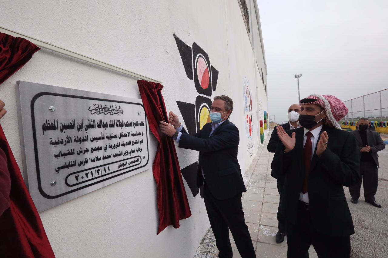 وقام النابلسي بحضور أمين عام وزارة الشباب الدكتور حسين الجبور و النائب نواش قوقزة والنائب فايزة عضيبات ومدير قضاء المصطبة عمر الشريدة بإنارة المجمع الرياضي، وافتتاح الحديقة المرورية داخل المجمع، والتي تم استحداثها مؤخراً وتشمل على مضمار مخصص للمشي وعبارات وإرشادات مرورية توعوية توضح أهمية الإلتزام بالقواعد المرورية وتغرس الثقافة المرورية بين الشباب والشابات، من خلال جملة من الدورات التدريبية التي ستنفذ بالتعاون مع مديرية الأمن العام، بالإضافة إلى مشاركته بحملة تطوعية، تضمنت زراعة الأشجار الحرجية، ورسم جدارية لشعار مئوية الدولة لتكريس وتنمية الحس الوطني والمجتمعي لدى الشباب، بحضور مدير قضاء برما طارق المجالي.