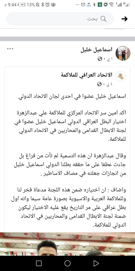 وكان امين سر الاتحاد المركزي للملاكمة العراقي علي عبدالزهرة اختيار البطل العراقي الدولي اسماعيل خليل عضوا في لجنة الابطال القدامى والمحاربين في الاتحاد الدولي للملاكمة.