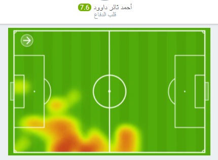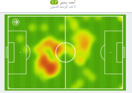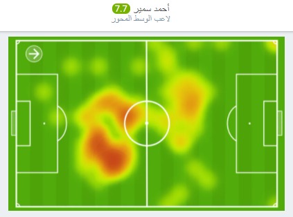 احمد سمير لمس الكرة 60 مرة مرر منها 48 تمريرة 43 منها مكتملة بنسبة 90 % وصنع هدف الفريق الاول من احداها حيث نفذت من ركلة ركنية .وسدد تسدتين واحدة منها كانت بين الخشبات الثلاث وصنع 3 قرص للفريق كانت واحدة منها خطيرة اما على المستوى الدفاعي فقد حصل على تقييم 100% من اعتراضات كلها ناجحة .
