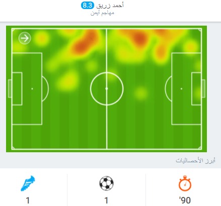ب 48 لمسة للكرة مرر الزريق 29 تمريرة كانت 25 منها صحيحة اهمها تمريرة الهدف لانداي وبعد دقيقة من دخوله الملعب فقط حيث حقق تفوقا بالتمرير بنسبة 86% وسدد مرتين على المرمى سجل هدفا منهما