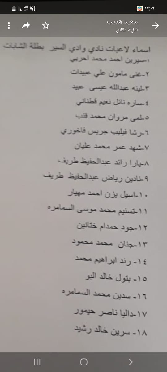 احتفل نادي وادي السير الرياضي برعاية متصرف وادي السير، بتكريم نشميات النادي،بمناسبة حصول الفريق على لقب دوري الشابات لكرة اليد للسنة الثالثة على التوالي، في منتجع البيارة، وبحضور رئيس مركز امن البيادر، ورئيس النادي، والمحاميان محمد العطار ورامي السليحات، ورئيس اللجنة الرياضية بالنادي والمدير الفني للفرق الرياضية المهندس محمد الحلو.