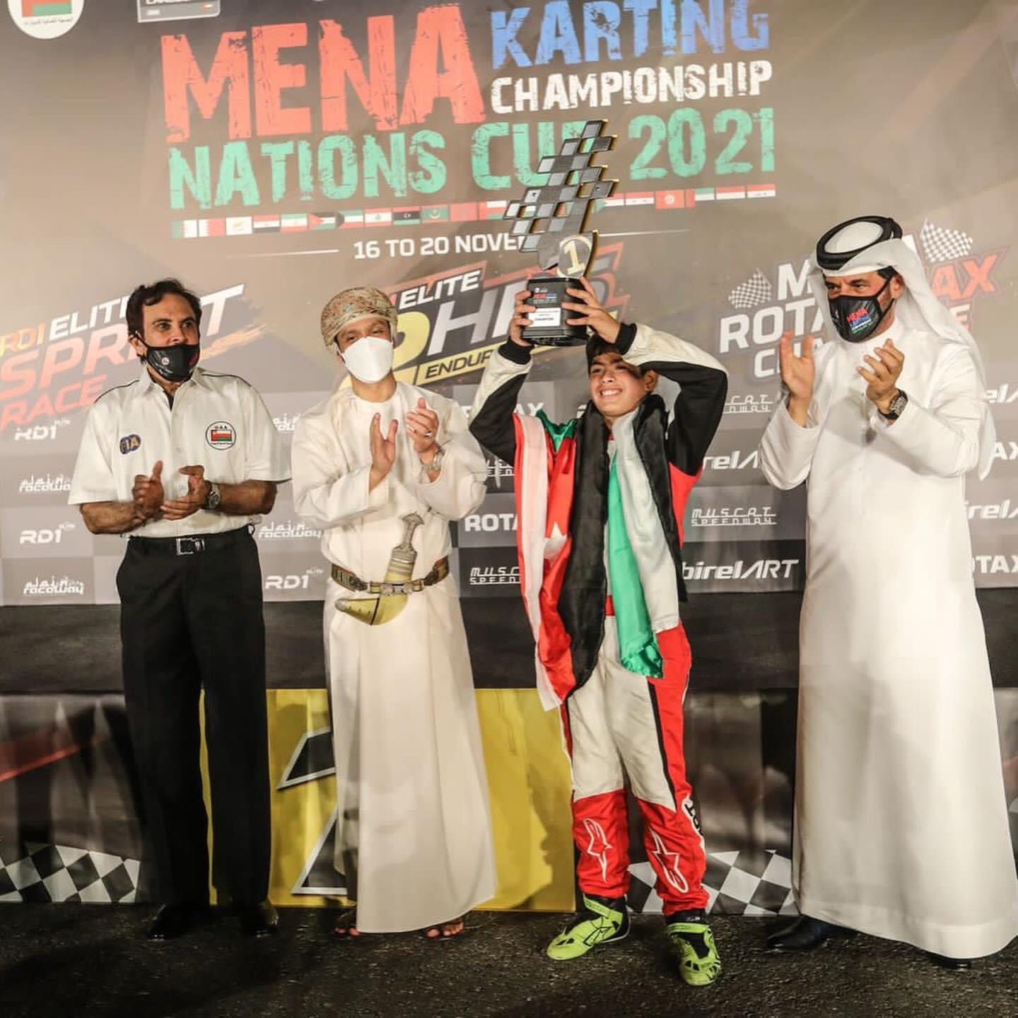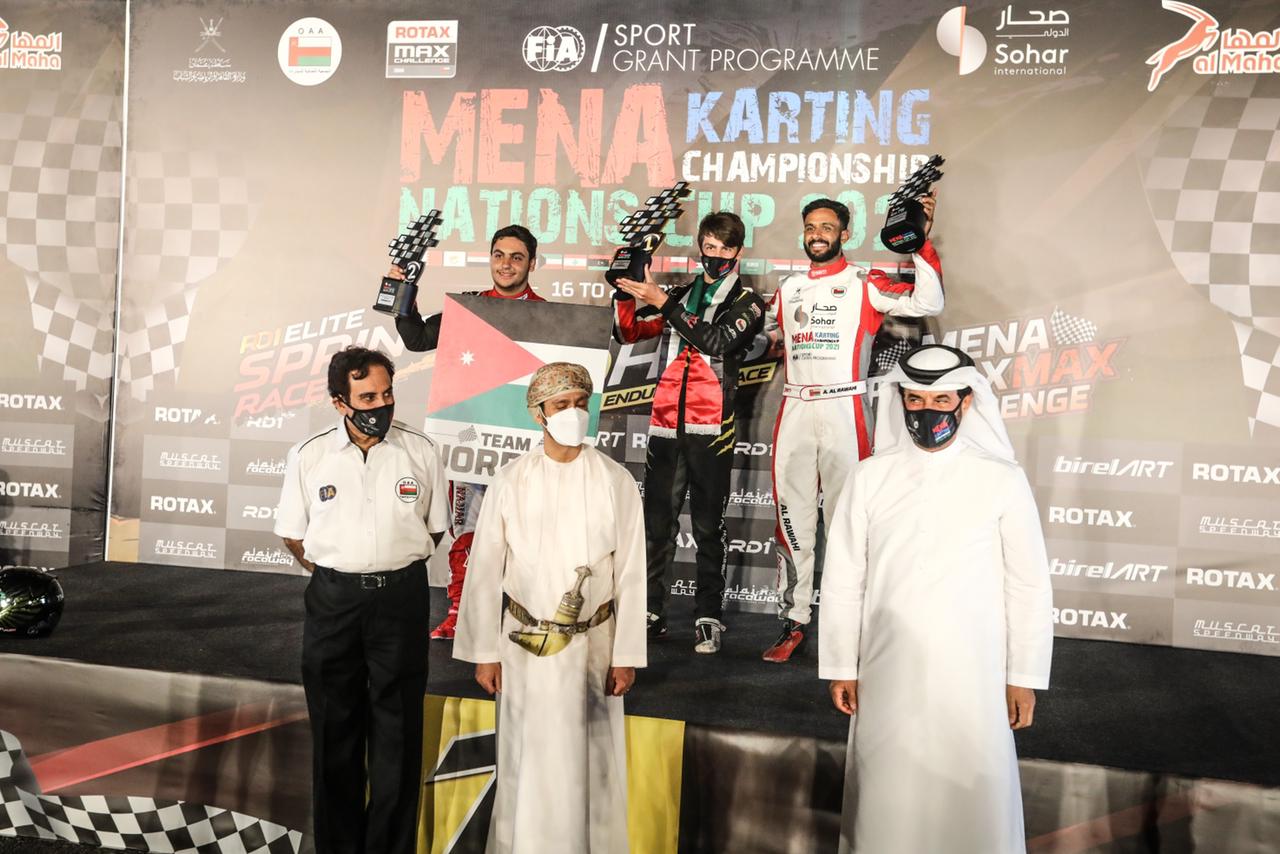 توج  للمرة الأولى البطل الأردني حمزة الفايز بلقب في الجونيور – ماكس في بطولة الشرق الأوسط وشمال أفريقيا للكارتينغ “كأس الأمم”، التي انتهت منافساتها يوم السبت في حلبة مسقط سبيد واي في العاصمة العُمانية ، كما تألق البطل الأردني أمير النجار محرزا المركز الثاني في فئة السينيور- ماكس للمرة الأولى وشهدت البطولة مشاركة نحو 160 متسابق من 19 دولة وهي الأردن وسلطنة عُمان والإمارات والسعودية وقطر والبحرين والكويت واليمن وسوريا ومصر والجزائر والأردن وتونس وفلسطين والمغرب وتركيا وليبيا وقبرص ولبنان وموريتانيا.