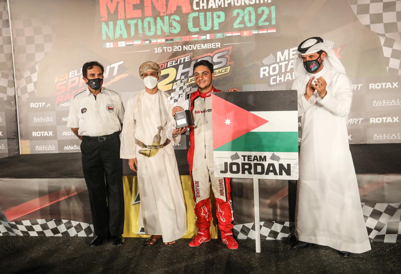 توج  للمرة الأولى البطل الأردني حمزة الفايز بلقب في الجونيور – ماكس في بطولة الشرق الأوسط وشمال أفريقيا للكارتينغ “كأس الأمم”، التي انتهت منافساتها يوم السبت في حلبة مسقط سبيد واي في العاصمة العُمانية ، كما تألق البطل الأردني أمير النجار محرزا المركز الثاني في فئة السينيور- ماكس للمرة الأولى وشهدت البطولة مشاركة نحو 160 متسابق من 19 دولة وهي الأردن وسلطنة عُمان والإمارات والسعودية وقطر والبحرين والكويت واليمن وسوريا ومصر والجزائر والأردن وتونس وفلسطين والمغرب وتركيا وليبيا وقبرص ولبنان وموريتانيا.
